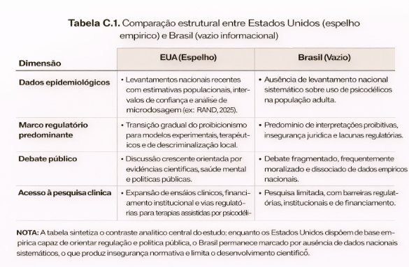 O contraste estrutural entre a base empírica disponível nos Estados Unidos e o vazio informacional brasileiro pode ser sintetizado na Tabela C.1, que explicita as assimetrias em dados epidemiológicos, regulação, debate público e acesso à pesquisa clínica. Deve começar por algo mais fundamental: informação e conhecimento.