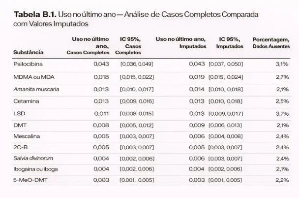 Embora a psilocibina lidere com ampla vantagem, os dados indicam a existência de uma diversidade de substâncias cujo uso permanece pouco reconhecido no debate público. Após a psilocibina (~11,1 milhões), aparecem: