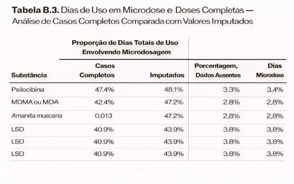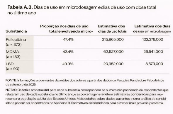 Mais impressionante ainda é a análise de dias agregados de uso. Adultos norte-americanos utilizaram psilocibina por aproximadamente 216 dias no ano (no período de 12 meses analisado), dos quais cerca de 102 — quase metade — corresponderam à microdosagem. Padrões semelhantes aparecem para MDMA e LSD, com cerca de 40% a 42% dos dias de uso em microdose, conforme observado na Figura 3 e Tabela A.3.