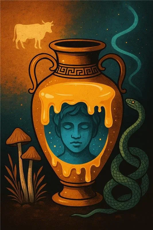 Além disso, o mel é um antisséptico natural, tradicionalmente usado em diversas culturas para conservar substâncias sagradas. No México, há registros antigos do uso do mel para preservar cogumelos contendo psilocibina, prática que persiste até hoje. No Rig Veda, textos sagrados da Índia, o mel aparece com frequência associado ao Soma, a substância da imortalidade. E Heródoto conta que os babilônios conservavam seus mortos em mel, assim como se usavam grandes vasos — phitoi — para sepultamento durante a Idade do Bronze egéia. O mel não é apenas doçura: é ponte entre mundos, veículo de permanência.