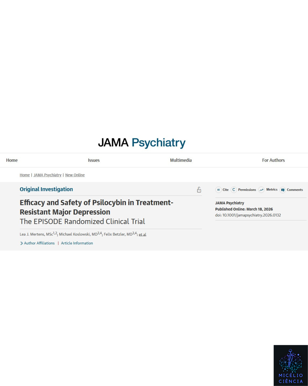 Mertens LJ, Koslowski M, Betzler F, Brand M, Evens R, Kärtner L, Jungaberle A, Jungaberle H, Majic T, Schmitz CN, Ströhle A, Scharf D, Spangemacher M, Wolff M, Assadi Z, Bahri S, Becher L, Färber LV, Kirchen N, Kulakova E, Kunz L, Meijer A, Rohrmoser B, Wellek S, Berger MM, Gründer G. Efficacy and Safety of Psilocybin in Treatment-Resistant Major Depression: The EPISODE Randomized Clinical Trial. JAMA Psychiatry. 2026 Mar 18:e260132. doi: 10.1001/jamapsychiatry.2026.0132.